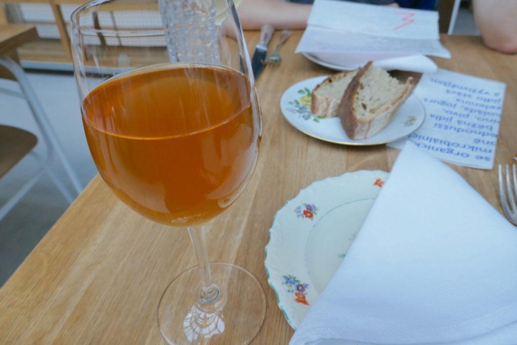 こちらがオリジナルドリンクと、奥には食前にサーブされる自家製パン。このドリンクはフルーツビネガーと果汁を割ったような甘酢っぱい味。