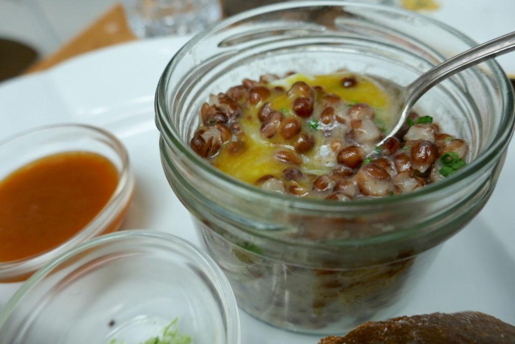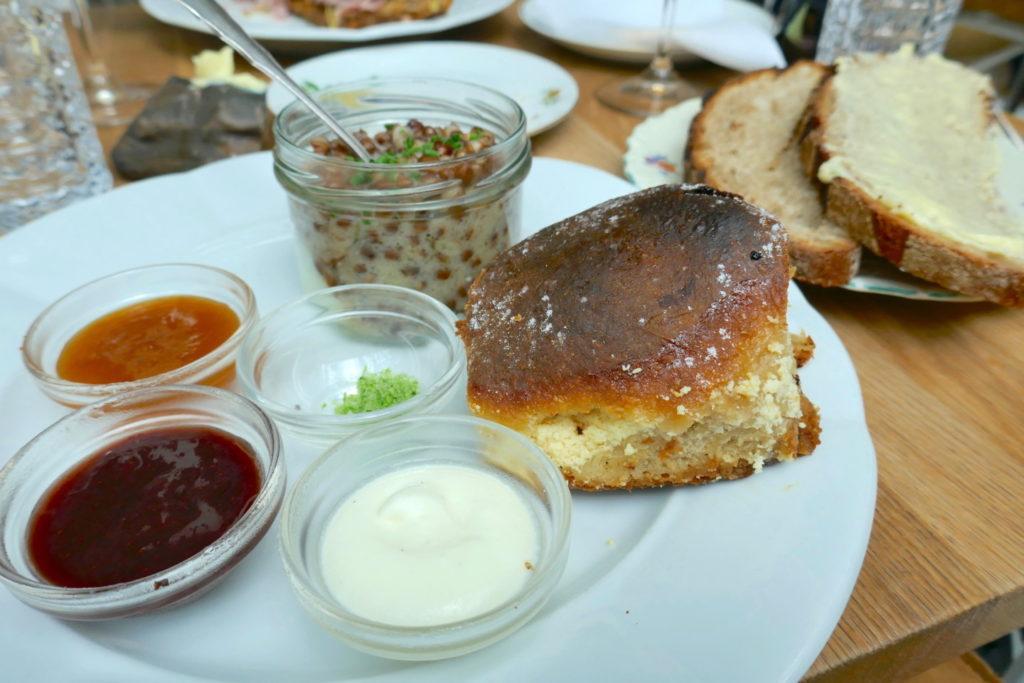 次に出てきたこちらがBreakfast Eska。奥の炭火で焼いたパン、手前の甘いチーズが入ったパン、自家製ジャムとハーブソルト、ケフィア、お兄さんの話にも出てきたRed Wheatの料理を含んだプレートです。