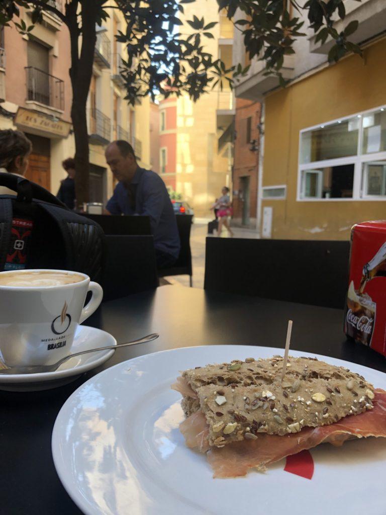 それこそトプの写真のムルシアのどセンター、ムルシア大聖堂のすぐそばのカフェでパンと飲み物の朝ごはんが2ユーロ