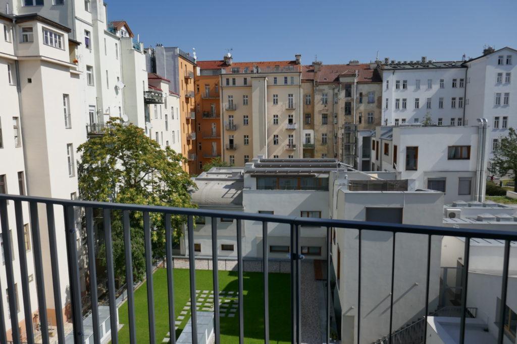 Belgicka Apartmentsの中庭は居住用の建物に囲まれているので、基本的に静かです。寮内には夜10時を過ぎたら騒がないように!と注意書きがありますが、騒いでいる人たちに対して向こうの建物から怒鳴り声が飛んでくる、なんてこともたまに目にしたりもしました。