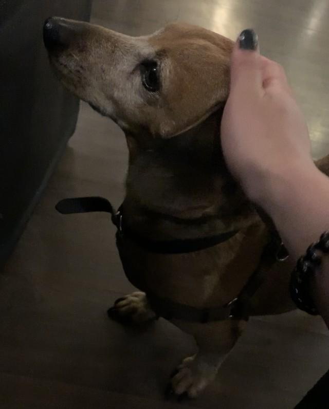 ミニチュアダックスフンドと思われる可愛いワンチャンが迎えてくれます。